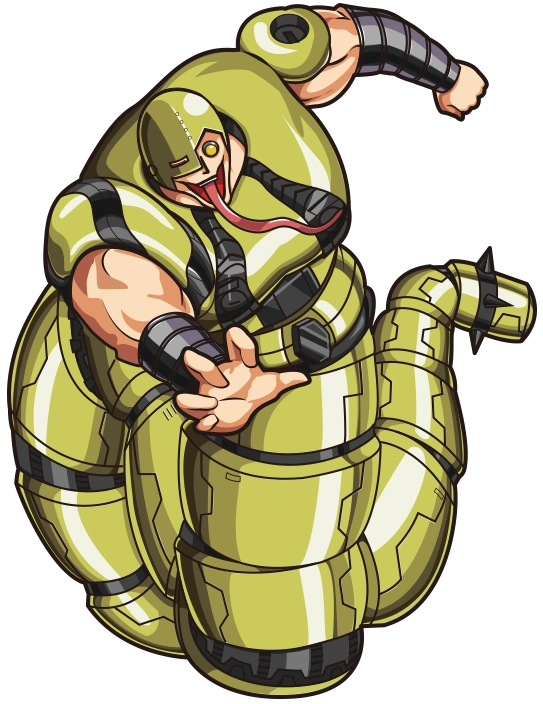 He is a chojin based off a half-snake half-human hybrid, but with a mechanical body, making him a hard opponent to damage. He has a helmet that covers his head and part of his face, leaving only his mouth, nose, and left eyes uncover.