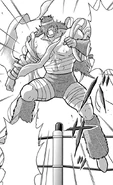 It is Geronimo who realises he is still alive, and that they can revive him by shocking his heart. A well opens up that leads to inside Warsman's body, but only five people may enter, and so Geronimo bravely leads the way inside. He goes with Terry, Robin, Brocken Jr. and Kinnikuman into Warsman’s body. [13] A five-tier ring appears, with each ring holding a different opponent. [14] Geronimo fends off The Ninja on the fourth floor, while Kinnikuman climbs the spine to reach the top ring. [14] The Ninja switches places with Sunshine, forcing Geronimo to compete against him. [15] At one point, he skewers the mat with his tomahawks so that Terry - in the ring below - could grab a hold of something during Asuraman’s Asura Buster. [16]