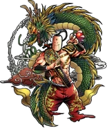 He has an oval-shaped face with a Fu Manchu moustache and wears a queue hairstyle. On his forehead is the kanji 中 (Chū), which is the first character in 中国 (Chūgoku), the Japanese word for China.