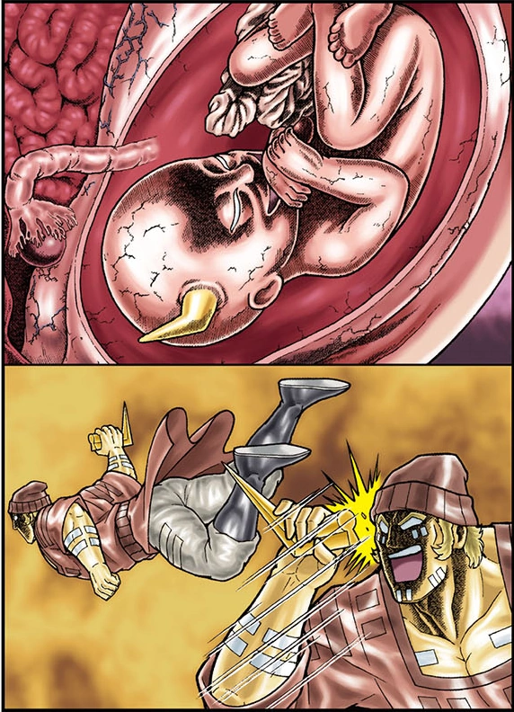 A mutated breed of Brutal Chojin, they have revealed themselves to Alexandria Meat and the others. [1][2] They possess a Majikaku (魔時角, Demonic Time-Horn), which sprouts from their heads. [3] If this horn is broken off, they gain the ability to travel a single period of time from their preferred period of time, at their discretion. [2] Once the horn is removed, the location of the hole becomes a keyhole-shaped scar and releases a substance that can control time. [2][3] After time-travel, the key-hole remains an open wound. [4]